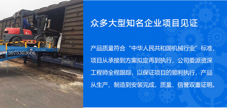 >> 13年的登车桥设备制造经验 集设计、研发、生产和销售于一体的制造型企业,专业制造液压登车桥,移动式登 车桥和高空作业平台,经验丰富,拥有强大的成产技术和完善的管理模式。 >> 引进国际先进施工工艺 配备整套专业自动化生成设备,引进国外先进技术, 定期培训,确保设备的高品质。 产品具有设计新颖、结构合理、升降平稳、载重安全、操作简单、维护方便等优点。